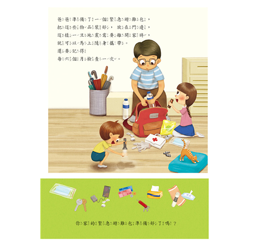 繪者很喜歡前後扉頁的設計,用線條的方式製造趣味感,卻仍能因為細節的寫實而輕易辨識出物品。前扉頁是避難包的各項物品,大家都頗為熟悉。後扉頁則是各種救難工具,在蒐集資料時讓人大開眼界,見識到了許多以前聽都沒聽過的、厲害的工具及用法。