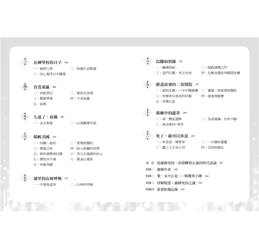 本書還附有謝緯夫人、楊瓊英醫師的小傳,讓人更加瞭解謝緯能專心於醫療宣教事工的背後支持。此外,當年謝緯出意外車禍,迄今仍被多方「懷疑討論」,本書也收錄了關於謝緯死因之謎,為讀者提供另一種觀點。