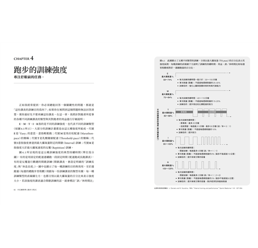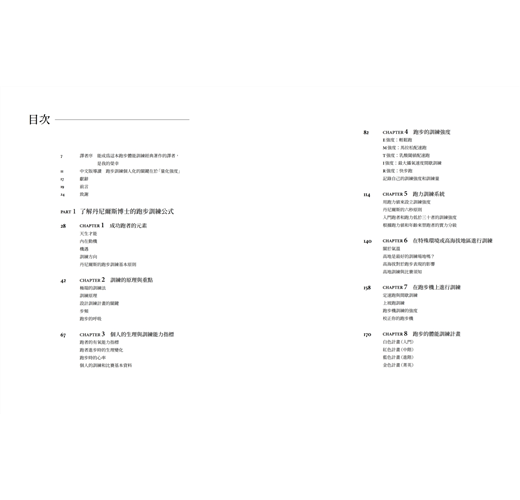 本書共分兩大部分,第一部分首先講解跑步訓練的重要原則與科學知識,以及訓練的原理與重點,並詳細介紹整套「跑力系統」的架構及運用方法,還進一步提供了針對不同年齡層,從6歲到80歲跑者的特定調整建議。此外,博士也介紹了包括跑步機訓練、在高海拔或其他具挑戰性環境中的訓練方法,以及從入門、中階、進階到菁英等各種體能階段的訓練方式。最後,他也提供了休息與補強訓練的建議,幫助因主動或被迫休息的跑者能夠順利重回跑場。