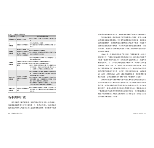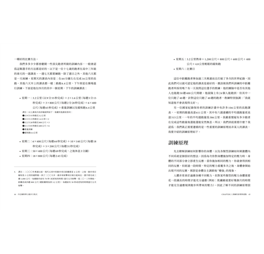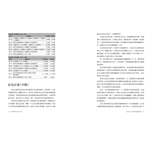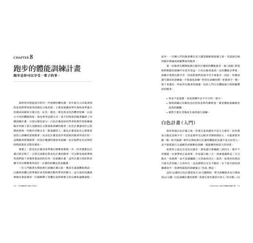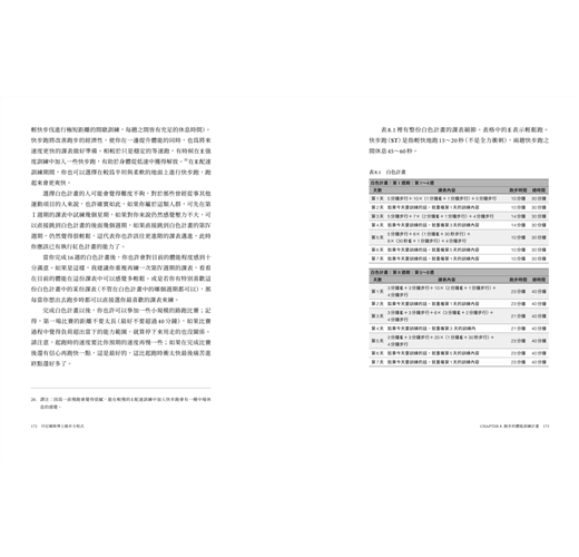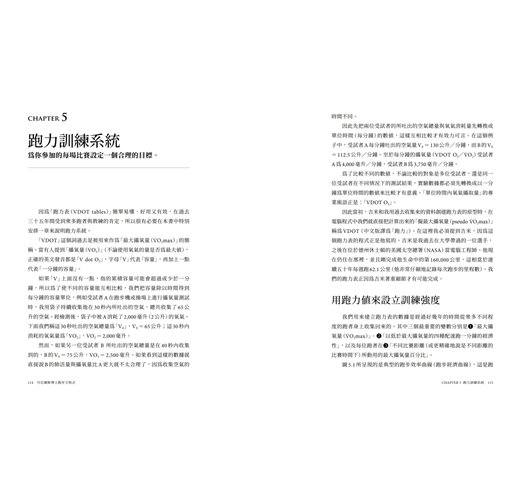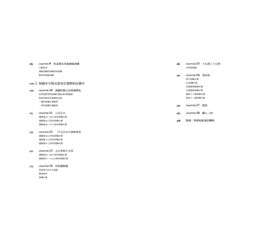 而在第二部分,博士將跑步相關比賽分為八類,分別是八百公尺、一千五百公尺到兩英里、五公里到十公里、田徑越野跑、十五到三十公里、全馬、超馬和鐵人三項,分別提供了詳細的課表範例,教導讀者如何運用跑力系統,實際設計最符合跑者當下需求與條件的訓練計畫。