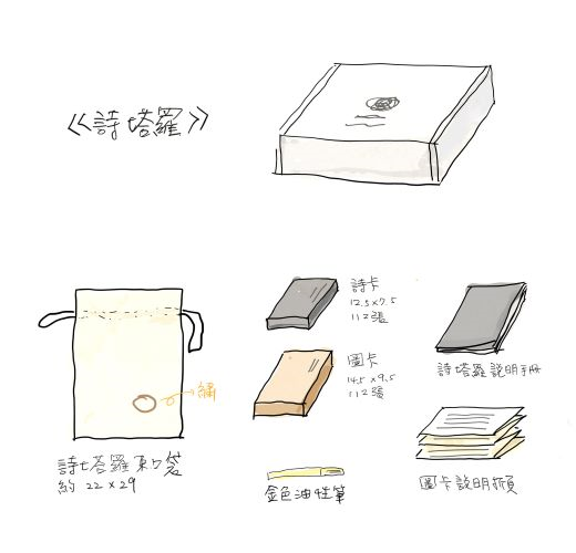 《詩塔羅》的99張詩卡擷取自葉覓覓近二十年來的詩作,99張圖卡多半是詩人在旅途中捕捉的吉光片羽。透過雙卡抽選,向牌卡提問,便能在文句與圖像結合的嘹浴空間中找到屬於自己的答案。附贈2張驚喜卡,以及空白卡片24張,供使用者自由書寫與塗鴉。