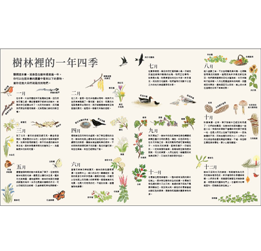 ․附有「樹林裡的一年四季」觀察曆,介紹每個月可觀察的花朵與動物,還可以回到故事頁面,看看他們躲在哪裡。