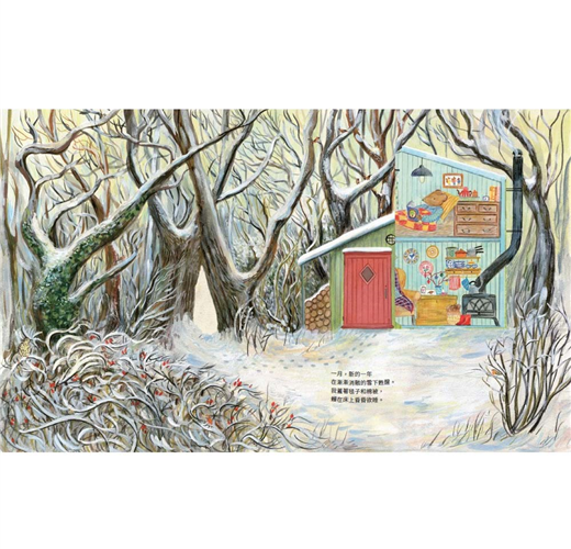 作者艾莉絲.梅爾文給了我們如詩一般的文本,簡短卻提點著季節特定的風采。簡要的詩文、豐美的畫面,作品緊密挾帶季節的印記,讓人彷彿置身其中,感受溫度變化,聽聞大地聲響。而作品的另一出色之處,是森林裡動物朋友的屋房,它們搭建得各有特色:有三角形屋、有圓桶造型房,有蓋於樹上的樹屋,也有可隨處移動的篷車。此外,掀頁的設計,讓我們可以一覽屋內陳設,樣樣皆透露著季節的訊號,為作品增添閱讀的樂趣。