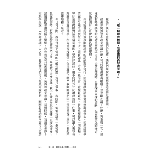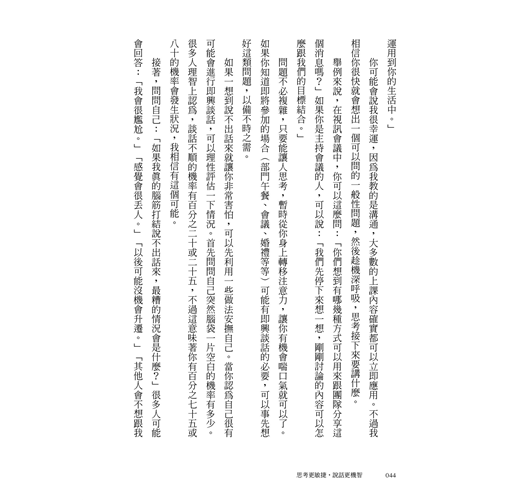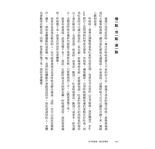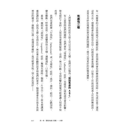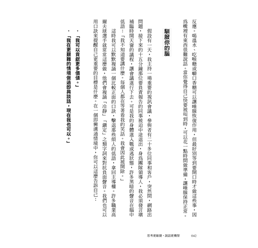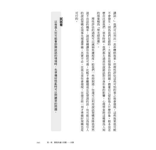 「本書針對各式各樣的溝通情境,提供了經過科學驗證的方法論,以及許多實用的工具和技巧,讓你可以透過持續練習,未來在任何要說話的場合,非但能夠不失常、正常發揮,更可以超常表現。」