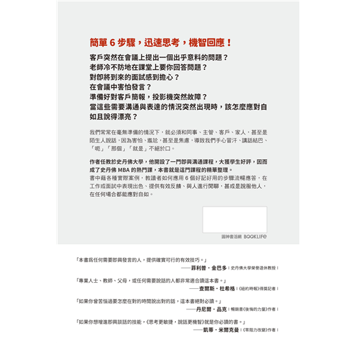 「作者在書中教我們克服難以預期的說話挑戰,其中提供了非常有用且具體的建議。」