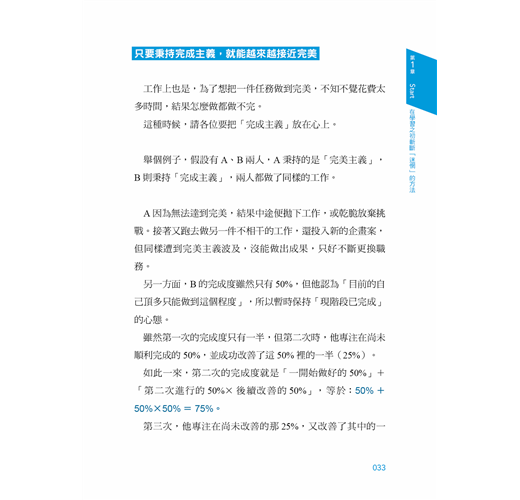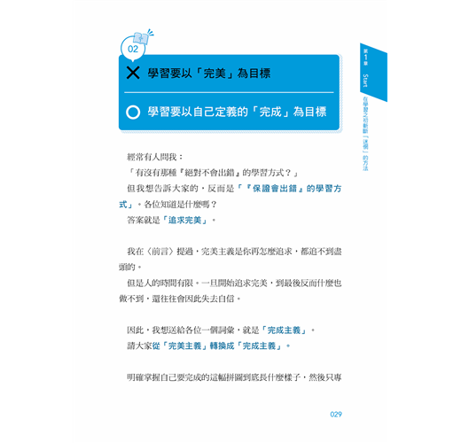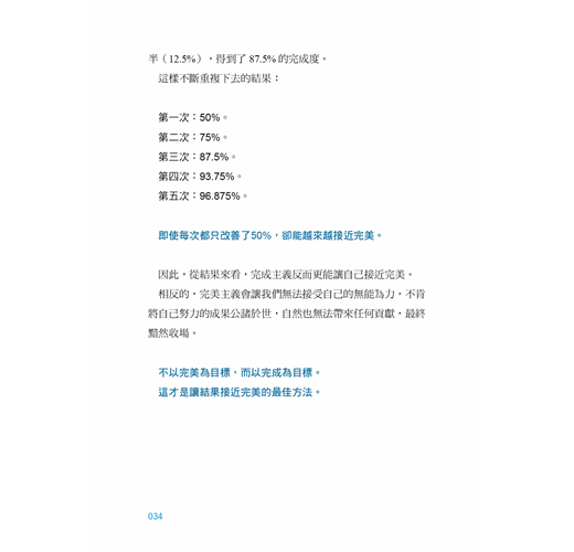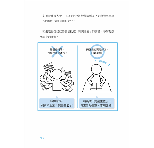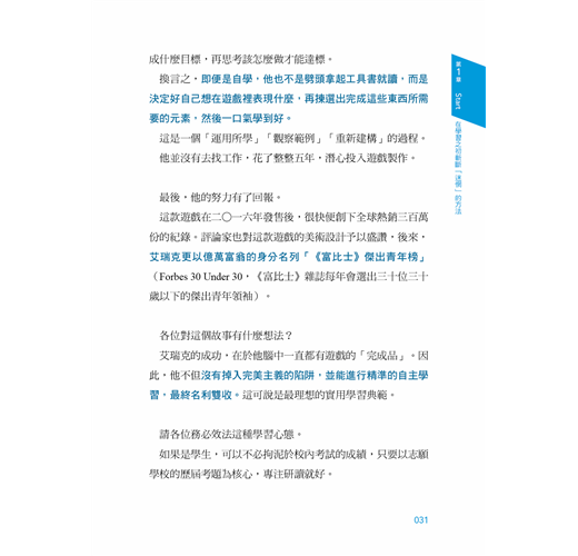 作者曾是個完美主義者,許多事情都非得做到完美才行。他不斷學習,卻也不斷失敗,最後把自己逼入絕境。明明越學越多,卻越來越沒有自信,所學的一切,全部淪為完美主義的犧牲品。