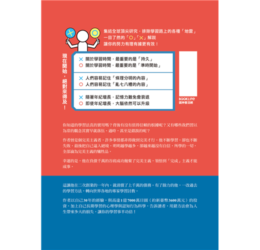 作者以自己30年的經驗,與高達1億7000萬日圓(約新臺幣3600萬元)的投資,加上自己長期學習的心理學與認知行為科學,告訴讀者,用錯方法會為人生帶來多大的損失,讓你的學習事半功倍!