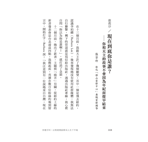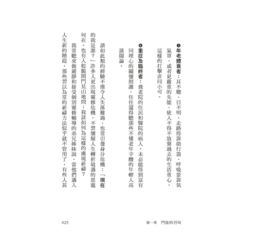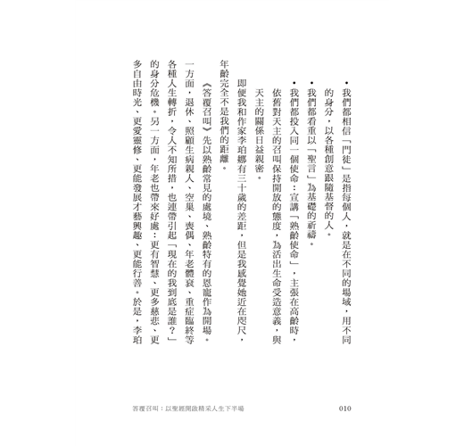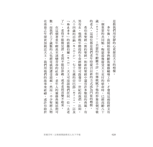 ◆ 適合讀經班、讀書會等成長團體共讀討論。為從事年長者牧靈關懷、老人事工的工作者,以及渴望加深信德的教友、神父、神師、靈修輔導者帶來啟發。