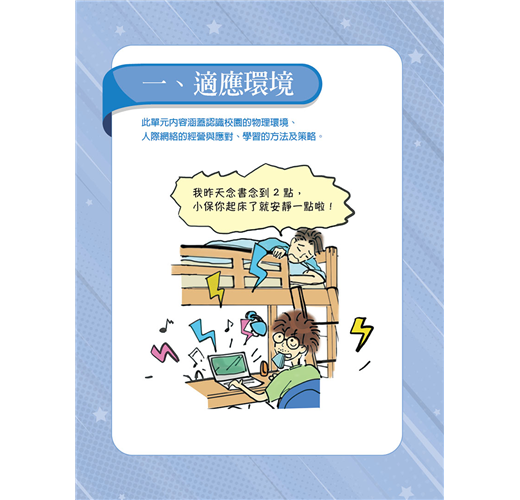 此單元內容涵蓋認識校園的物理環境、人際網絡的經營與應對、學習的方法及策略。