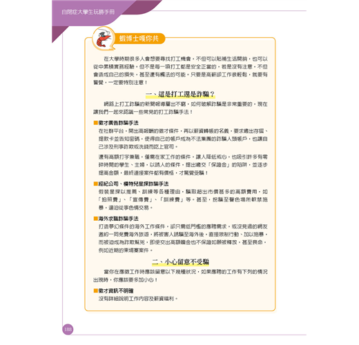 ● 本書適合作為高中職階段教師和大專資源教室輔導老師的教材,也可以提供協助自閉症大學生的同儕或助理人員閱讀。