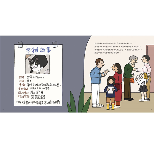 一張尋鞋啟事,引起孩子的好奇心,「尋鞋」與「尋協」的同音雙關語,更開啟了整本故事的協尋趣味。