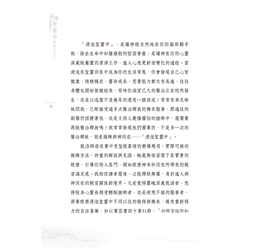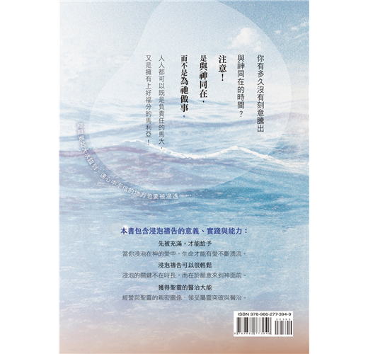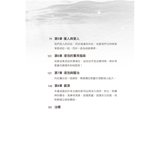 浸泡(soaking)的概念也許讓你一時無法理解,但是,這本美麗的書把它帶到實際的個人層次上,你會一邊讀一邊想直接躍入神的榮耀同在中。