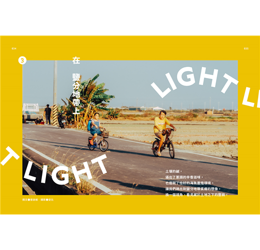 三寮灣與蘆竹溝兩個聚落同座落於台南著名的鹽分地帶上,卻由於靠海與否發展出不同的居民維生策略。「LIGHT」單元以產業為庄頭帶來的「亮」出發,呈現三寮灣因應高鹽分土地發展出的蔥田關水文化、蘆竹溝潟湖內的蚵棚和其他養殖漁業,以及兩庄共同面對的光電板議題。