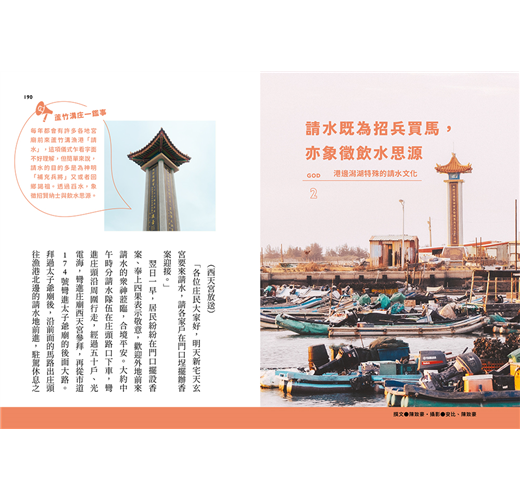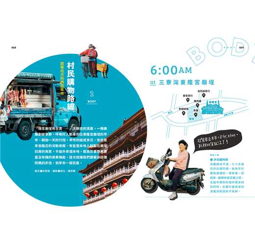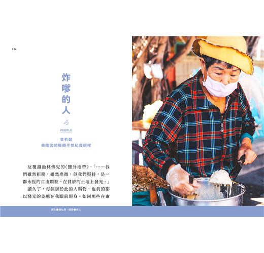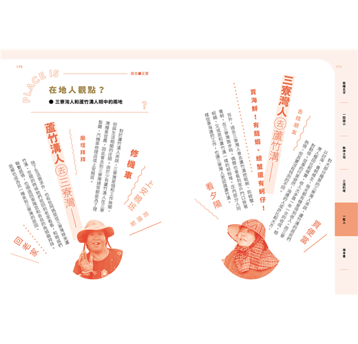 以聚落為題的地方誌,最大的魅力莫過於這種質樸無華的日常感。這本書裡的人,身為閱者的我們可能幾乎都不認識,但只要提及討海人、木工師傅、廟口擺攤的老闆、戴著碎花布帽遮陽的阿姨到移民來台深耕的新住民,我們又能迅速從腦中浮現身邊特定的人選。如此短暫的靈光一閃,卻讓我們有機會再好好看一眼,那些居住在相同島嶼的臉龐。