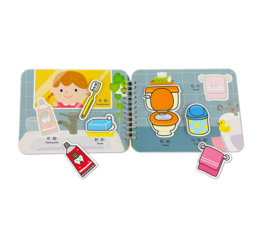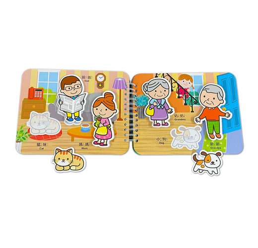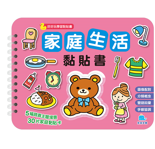 色彩鮮豔豐富、模樣生動可愛,讓孩子在看圖黏貼的遊戲中,一起認識家具、家人、寵物和生活用品等。