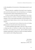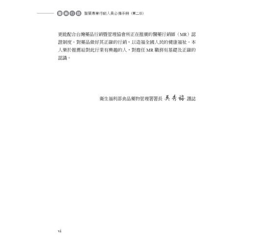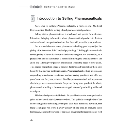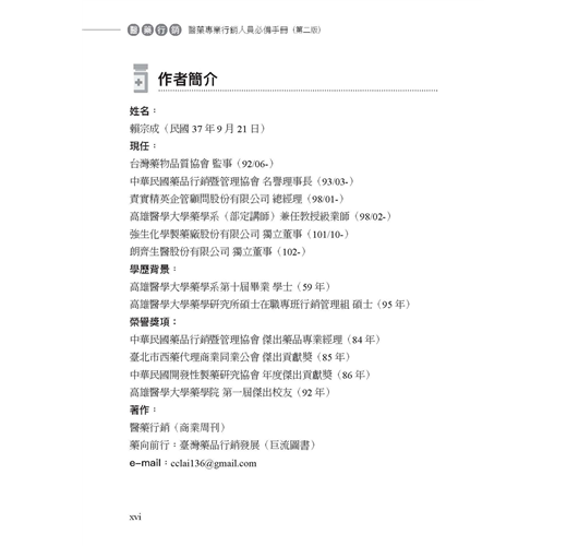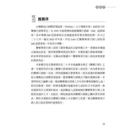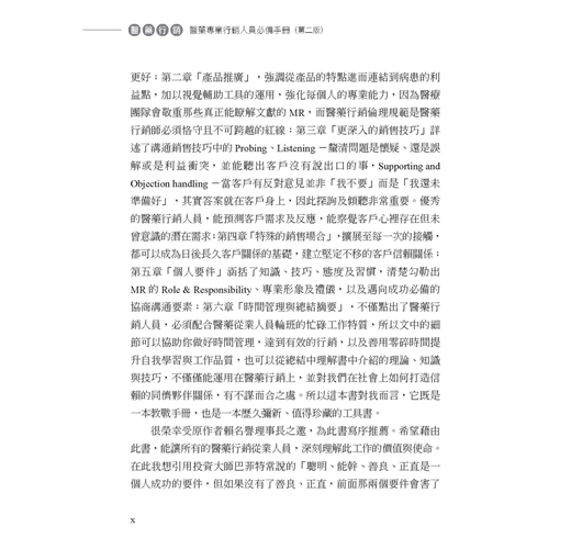 以前,醫藥專業行銷人員叫「Propa」,那時環境單純,每天提著皮包在競爭少之藥界,很快的就可達成營業目標。隨著競爭日益激烈,各行各業日趨專業化、行銷手法多元化、多樣化,醫藥專業行銷人員不單是只會做產品介紹或做好人際關係即可。必須隨著大環境之變化,尤其是政府法規政策之規定,在個別通路練就十八般武藝。全民健保實施之後,各醫院受到經營績效之考驗,衛生福利部中央健康保險署亦受到財務之嚴重壓力,而欲做各種變革,由論量計酬給付制度(Fee for Service),導入依病例給付(Case-Payment)、參考藥價(Reference Price)、藥品分類分組(Grouping)、依診斷群給付(D.R.G.)、依人口數給付(Capitation)、總額支付制度(Global Budget)等等。都會迫使業界經營益趨困難,如何在艱難的環境裡生存,就需靠醫藥專業行銷人員以最有效率的方法來推廣最有成本效益(Cost-Effectiveness)的產品。所以筆者認為當今的醫藥專業行銷人員更應精益求精使自己的銷售技巧、市場環境分析、時間運用、建立人際關係之技巧達到無懈可擊之地步。同時筆者憂心在此艱難的環境,產業界落入不擇手段、惡性競爭之境界。期望此書能引導所有的醫藥專業行銷人員,都能依照行銷規範做良性的互動,使產業界達到雙贏。進而確保用藥安全,與整個醫療團隊提升醫療品質,關懷人類健康,共築全民福祉。