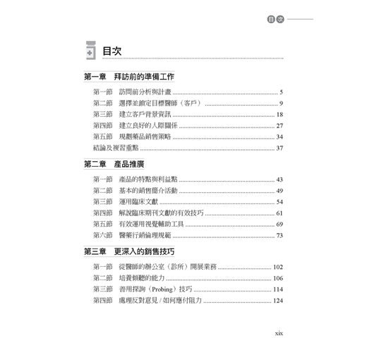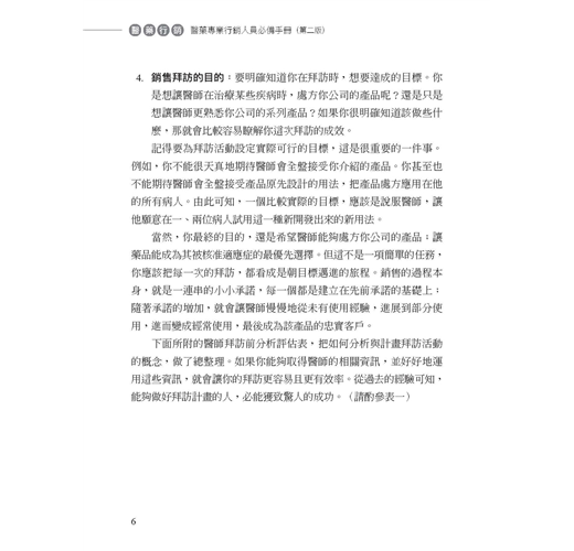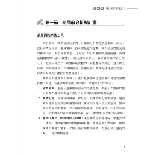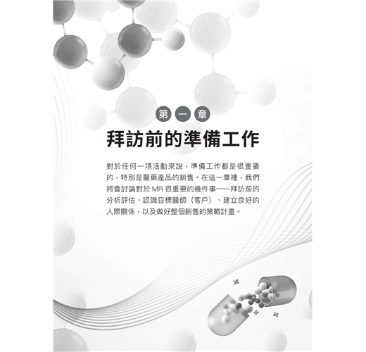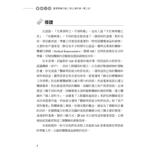 在本章裡,討論對於MR 很重要的幾件事:拜訪前的分析評估、認識醫師(客戶)、良好人際關係的建立,以及做好整個銷售的策略計畫。首先透過「醫師拜訪前分析評估表」,運用...
