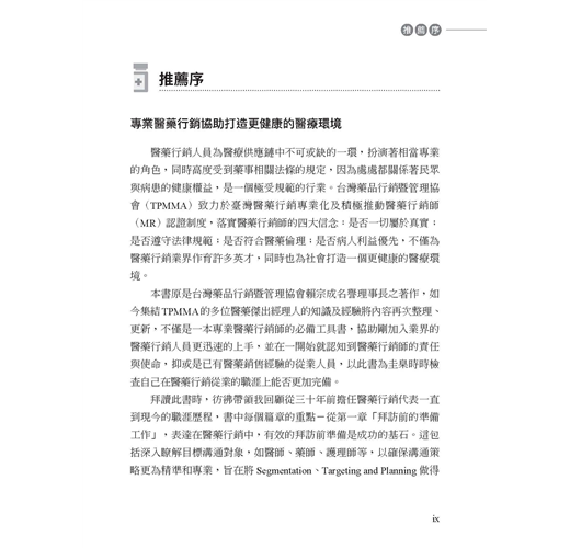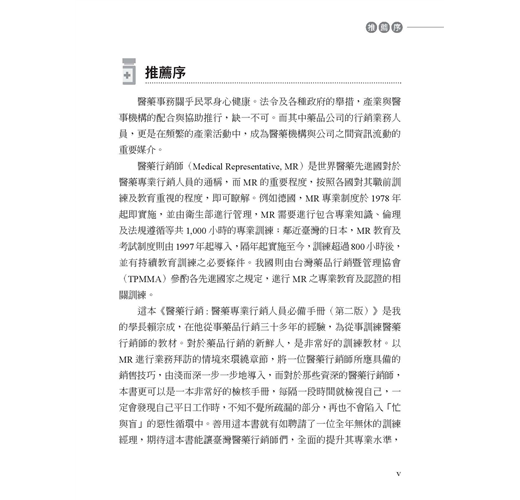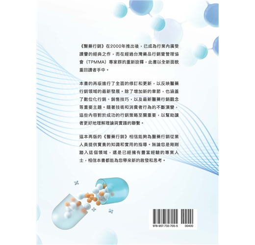 《醫藥行銷》在2000年推出後,已成為行業內廣受讚譽的經典之作,而在經過台灣藥品行銷暨管理協會(TPMMA)專家群的重新詮釋,此書以全新面貌重回讀者手中。