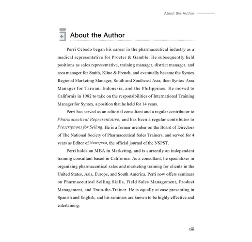 Perri Cebedo的職業生涯始於製藥公司基層業務代表,最終成為Syntex亞太區總經理。1982年,他移居加州,擔任Syntex國際培訓經理,並在該職位上擔任了14年。Perri目前是加州的獨立培訓顧問。作為顧問,他專門為美國、歐洲、亞洲、和中南美洲的客戶組織藥品銷售和行銷培訓,提供有關藥品銷售技巧、現場銷售管理、產品管理和培訓師培訓的研討會。