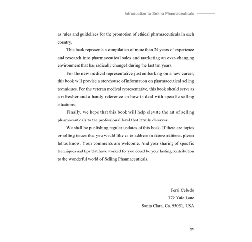 Perri從事醫藥專業行銷人員之訓練已有數十年,手頭上有許多資料,我們時常利用Perri 來臺灣做教育訓練或筆者到美國開會受訓互訪之機會進行討論,平時更透過e-mail 之聯繫,經過一年之努力使本書能順利完成。希望讓初入門者有一值得參考的導引,以免多走許多冤枉路。也希望讓已入門者平常有一日常檢視工作內容的對照表。更希望讓在校的同學們做生涯規劃或做行業抉擇時,有一工作性質的描述,免得讓年輕人入錯行。