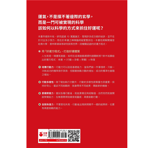 本書作者鈴木祐,研究超過10萬篇論文,發現許多成功者的祕訣,並不在於付出多少努力,而在於幸運之神降臨時能緊緊抓住。本書他將解開備受哈佛大學、普林斯頓高等研究院等世界一流機關認證的好運方程式。