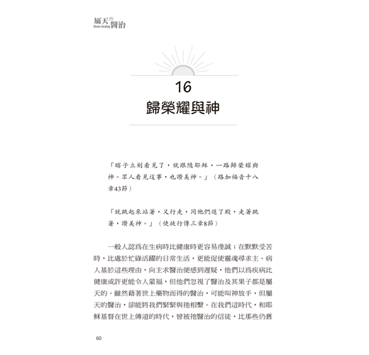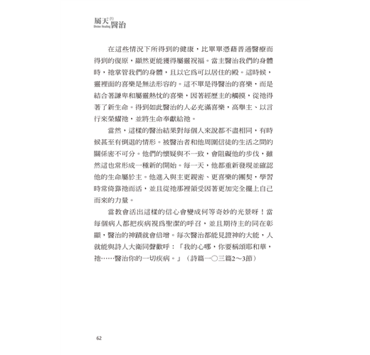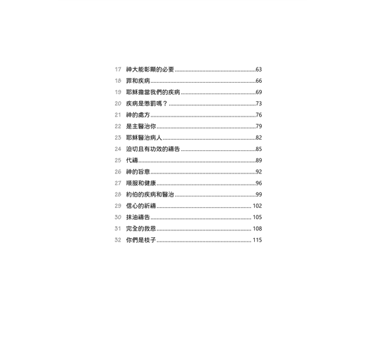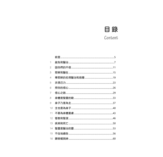 本書可視為我對屬天醫治篤信不疑的見證。在牧會工作停頓達二年後,慈愛的神終於垂聽了我的禱告,醫治了相信祂是醫治之主的我(參考出埃及記十五章26節)。