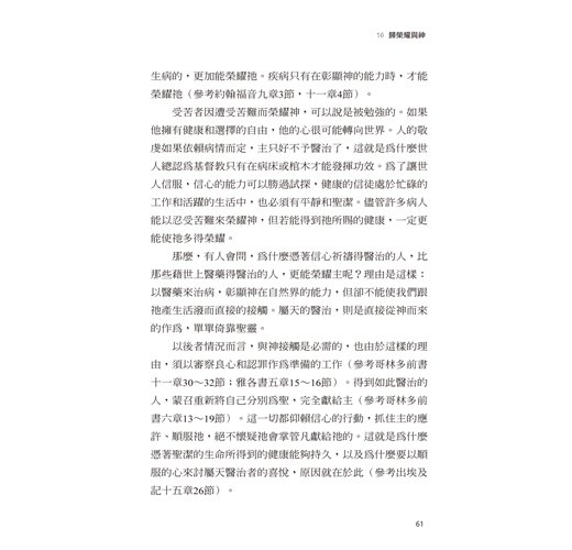 當教會活出這樣的信心會變成何等奇妙的光景呀!當每個病人都把疾病視為聖潔的呼召,並且期待主的同在彰顯,醫治的神蹟就會倍增。每次醫治都能見證神的大能,人就能與詩人大衛同聲歡呼:「我的心哪,你要稱頌耶和華,祂……醫治你的一切疾病。」(詩篇一○三篇2~3節)