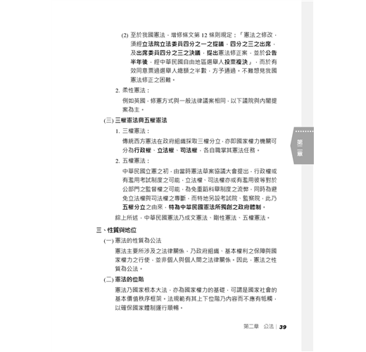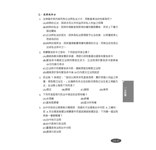 2.故為應對此種常識性考法,「民事法律」的概念最為重要。其原因不外乎是,民法為國民普遍交易最常接觸之法律,身為將來要成為農田水利署一份子的考生,也將會有面對民眾的需求,故以民法來建構基本法學素養是學好這科的不二法門,若考試準備時間有限的話,不妨先行閱讀本書詳盡、清楚的民法、民事訴訟法整理,而後再準備其他法律。