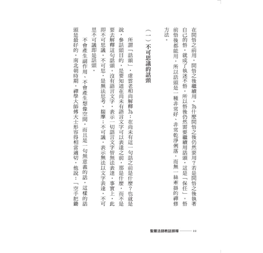 當然,最重要的是話頭四部曲:念話頭,問話頭,參話頭,看話頭。此對話頭方法的應用及次第,做了系統而清楚的說明,讓禪眾知道如何進入,如何持續用功,如何破參到如何保任。可說是歷代以來話頭禪法最精要的教學,也是修行話頭禪法者最好的指南。