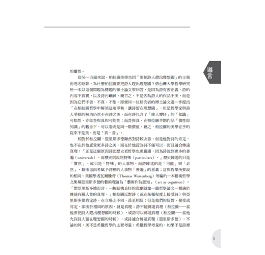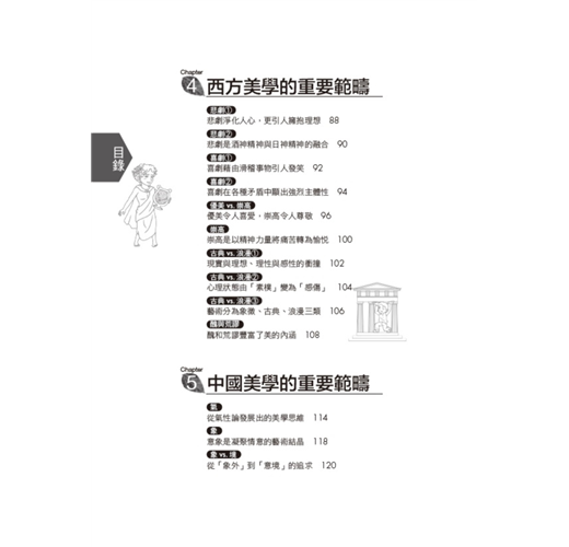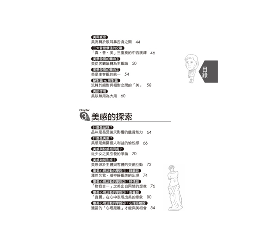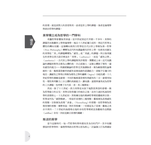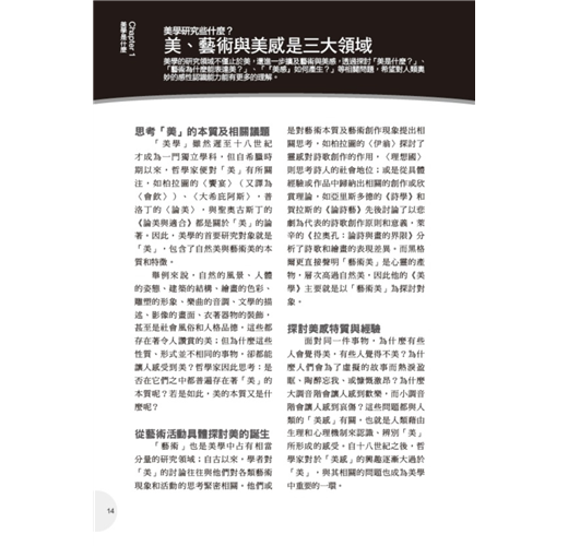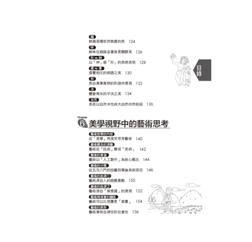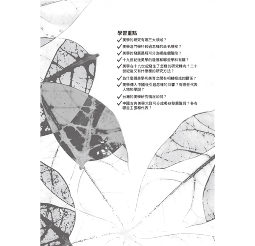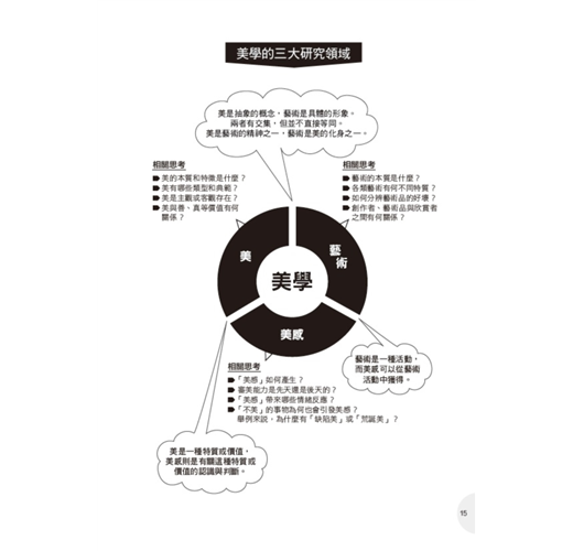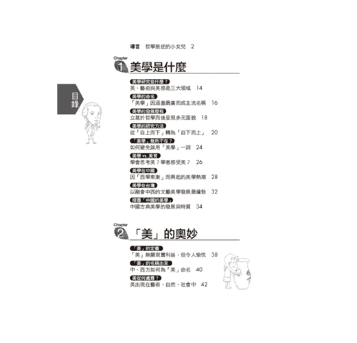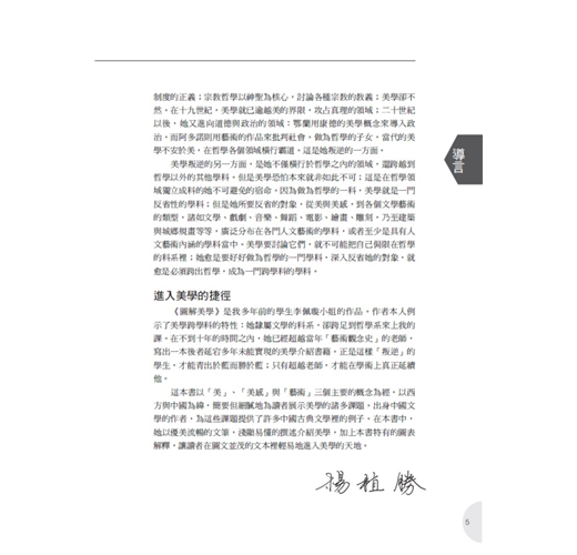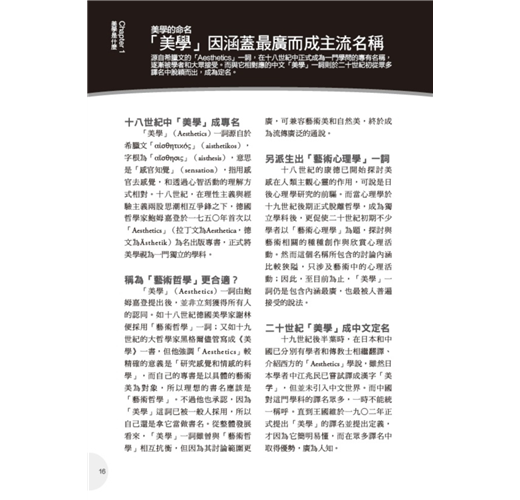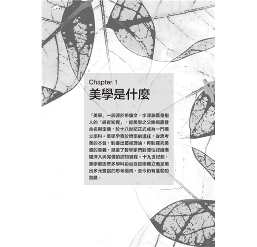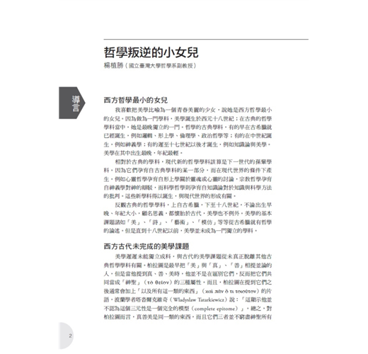 這本書以「美」、「美感」與「藝術」三個主要的概念為經,以西方與中國為緯,簡要但細膩地為讀者展示美學的諸多課題。作者以優美流暢的文筆,淺顯易懂的撰述介紹美學,加上本書特有的圖表解釋,讓讀者在圖文並茂的文本裡輕易地進入美學的天地。──審訂者 楊植勝(國立臺灣大學哲學系副教授)
