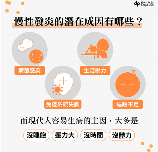 一般外觀常見的「紅、腫、熱、痛」症狀,屬於急性發炎,然而,還有一種症狀較輕、容易被忽略的,即是身體的隱形殺手──「慢性發炎」。它會以「容易疲倦、心情低落、腰痠背痛、腸胃敏感、皮膚發癢或紅腫」等症狀呈現,在體內慢慢侵蝕你的健康,時間一久甚至會造成嚴重、不可逆的傷害。