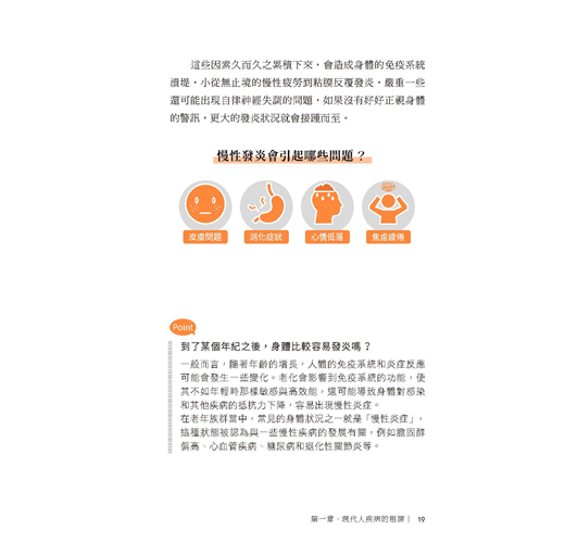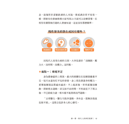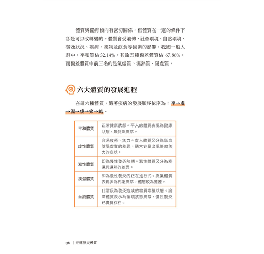 現代人談癌色變,但不只是癌症,許多慢性疾病如高血壓、糖尿病、腦中風、高血脂症、腎臟病,甚至如過敏性鼻炎、肥胖、記憶力衰退、失眠焦慮都和慢性發炎有關。而中醫強調全人醫療,預防醫學,上工治未病,每人皆有屬於自己的體質特點,本書將人體區分為六種體質,透過迅速、簡單、有效的中醫藥調理,達到陰陽平衡,遠離慢性發炎,是非常值得推薦的一本好書。