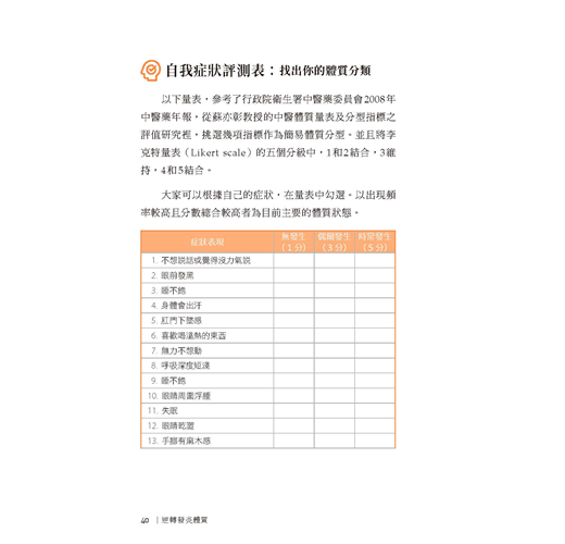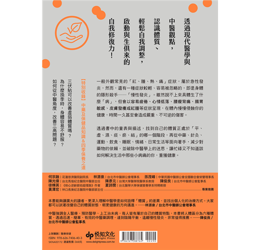 本書能夠讓廣大的讀者,更深入理解中醫學是如何詮釋「體質」的差異,並找出個人化的治療方式。大家都可以試著改變自己的體質狀態,朝著更健康的方向邁進(摘自推薦序)。