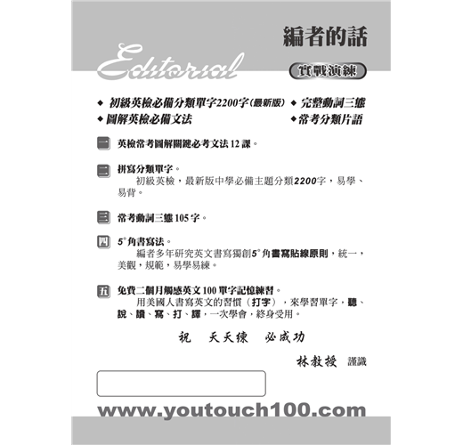◆ 加贈兩個月「觸感英文100」單字記憶數位平台使用(需至 www.youtouch.com 註冊),聽、說、讀、寫、打、譯一次完成。