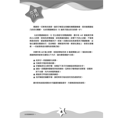 《迷你閱讀練習本 1》可以搭配任何閱讀課程,書中有42個寓教於樂的小故事,短短的故事篇幅,卻有無窮的趣味。故事下方的活動,不管是教師或家長,都能輕鬆帶著孩子一起做!本書的目的是激發孩子閱讀動機,並強化重要的閱讀技巧,如流暢度、理解度與字彙。教師在課堂教學、家長在家輔導,一定都能發現這本書用途很廣泛喔!
