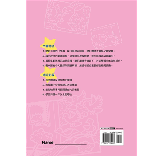 全書共有42個短篇小故事,每篇故事包含3題閱讀測驗與1個延伸活動。短篇故事題材活潑有趣,內容簡短易懂,輕鬆培養閱讀流暢度,讓孩子體驗英語閱讀的樂趣。延伸活動則包括創意繪圖、引導寫作等活動,幫助孩子發揮創意,發展基礎寫作能力。本書附有QR code音檔,一邊聽一邊唸,有效增加聽力與口語練習機會。現在就讓孩子在充滿趣味的小故事中,深植英語閱讀的實力!