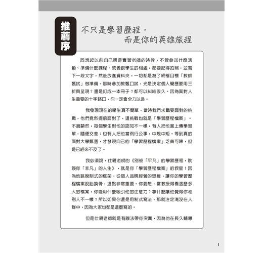 藉由仕親老師的這本專書付梓,我也想鼓勵正在升學壓力之中、偶爾會遇到挫折的同學們,正好可以藉著整理與製作學習歷程檔案的機會,跟著仕親老師書中的步驟與方法,深入認識自己的多元才能、找尋亮點與自我肯定。因為正是透過這個過程,讓同學們可以跳脫學業成績的制約,看見自己獨特的價值。如同當代作家三毛所說:「旅行是為了遇見一個真實的自己。」製作學習歷程檔案也就像是一場內在的旅行,幫助釐清與發現自己真正的樣貌、認識和肯定自己的獨特性,我相信同學們可以經由仕親老師的引導,建立起真正的自信,為未來的學習和挑戰打下穩固的基礎。