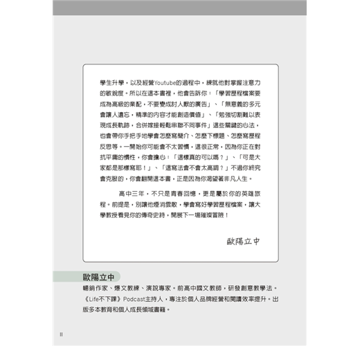 仕親老師比我了不起的地方,是他這個頻道維持定期更新到現在,而且愈做愈好。反觀我的頻道在疫情結束後,就進入半停更狀態,公餘有空時才錄製。相較之下,仕親老師的毅力著實令人佩服。他在這本書中將YouTube的經營技巧融入學習歷程檔案製作,從「品牌調性」、「經營管理」、「內容引導與寫作指南」以及「行銷策略」四個部分,手把手教導學生如何創建專屬的個人標籤,讓你的檔案有個人特色,教授能在最短的時間看到你的亮點,判斷你是否適合就讀。仕親老師這本書,不只談技巧,也無私分享了許多珍貴的心法。例如他借用YouTube「持續更新」的經驗,談到為什麼學習歷程檔案也需要有累積性,因為只有一次參與表演活動的經驗,沒有持續累積,是很難讓教授相信的。也正因為長期的積累,讓這個領域的學習品質不斷優化提升,專業性自然就顯現出來。