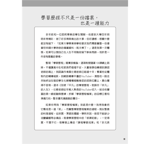 但是仕親老師就是有辦法帶你突圍,因為他在長久輔導學生升學,以及經營Youtube的過程中,練就他對掌握注意力的敏銳度。所以在這本書裡,他會告訴你:「學習歷程檔案要成為高級的業配,不要變成討人厭的廣告」、「無意義的多元會讓人遺忘,精準的內容才能創造價值」、「勉強切割難以表現成長軌跡,合併嫁接輕鬆串聯不同事件」這些關鍵的心法, 也會帶你手把手地學會怎麼寫簡介、怎麼下標題、怎麼寫歷程反思等。一開始你可能會不太習慣,這很正常,因為你正在對抗平庸的慣性,你會擔心:「這樣真的可以嗎?」、「可是大家都是那樣寫耶!」、「這寫法會不會太高調?」不過你終究會克服的,你會翻開這本書,正是因為你渴望著非凡人生。