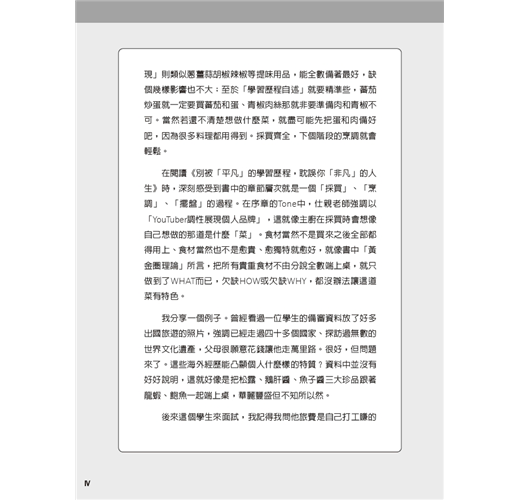 在閱讀《別被「平凡」的學習歷程,耽誤你「非凡」的人生》時,深刻感受到書中的章節層次就是一個「採買」、「烹調」、「擺盤」的過程。在序章的Tone中,仕親老師強調以「YouTuber調性展現個人品牌」,這就像主廚在採買時會想像自己想做的那道是什麼「菜」。食材當然不是買來之後全部都得用上、食材當然也不是愈貴、愈獨特就愈好,就像書中「黃金圈理論」所言,把所有貴重食材不由分說全數端上桌,就只做到了WHAT而已,欠缺HOW或欠缺WHY,都沒辦法讓這道菜有特色。