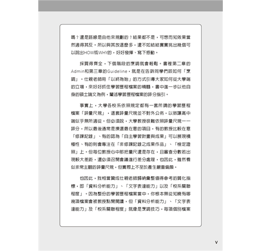 採買得齊全,下個階段的烹調就會輕鬆。書裡第二章的Admin和第三章的Guideline,就是在告訴同學們該如何「烹調」。仕親老師用「以終為始」的方式引導大家如何從大學端的立場,來好好抓住學習歷程檔案的精髓,書中進一步以他自身的碩士論文為例,闡述學習歷程檔案的評分指引。