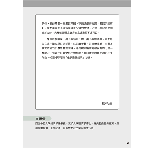 學習歷程檔案千萬不要造假、也千萬不要急就章,大家可以在高中階段就好好採買、好好磨手藝、好好學擺盤,把這本書當成秘笈反覆思量並演練。這份檔案製作的過程會內化成一種能力,有朝一日會變成一種態度。當日後回想起走過的許多階段,相信將不再有「往事霸圖如夢」之憾。
