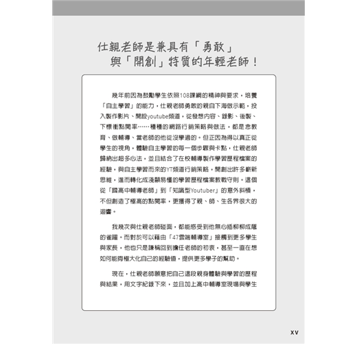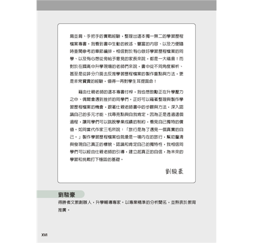 現在,仕親老師願意把自己這段親身體驗與學習的歷程與結果,用文字紀錄下來,並且加上高中輔導室現場與學生肩並肩、手把手的實戰經驗,整理出這本獨一無二的學習歷程檔案專書。我看到書中生動的敘述、豐富的內容、以及方便隨時查閱參考的章節編排,相信對於有心做好學習歷程檔案的同學、以及有心想從旁給予意見的家長來說,都是一大福音!而對於在國高中升學現場的老師們來說,書中從不同角度解析、甚至是從評分介面去反推學習歷程檔案的製作重點與方法,更是非常寶貴的經驗,值得一再對學生耳提面命!
