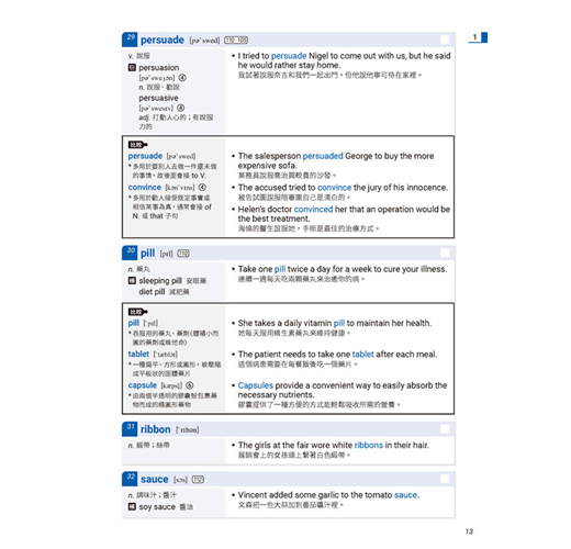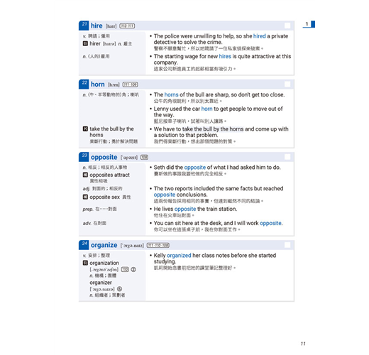 我們參考近十年來學測單字的出現頻率、重要程度、及各版本教科書內容,將Level 3單字平均分配在全書24個單元裡,再依照字母順序做單字的條列式排列。每一個單元約有40~42個主要單字,皆搭配使用例句讓讀者知其用法。版面配置清楚明瞭,節省更多學習時間。