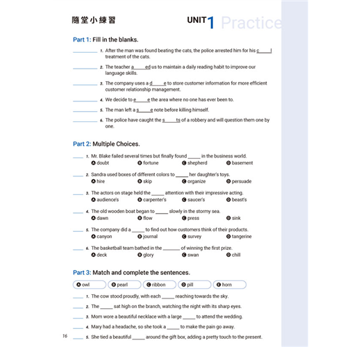 每一單元結束時,均有一個隨堂小練習,以填空、選擇、配合等三種題型來幫助讀者複習該單元詞彙。看似簡單的題目,仍需要精準的拼字能力和上下文理解,才能做出正確答案,可不要掉以輕心囉。學習之後立即驗收,效果立竿見影。