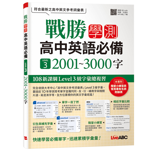 本書《戰勝學測 高中英語必備LEVEL 3 2001~3000字》完整收錄Level 3的單字,搭配書中三大特色,帶領讀者穩紮穩打學好每一個單字。