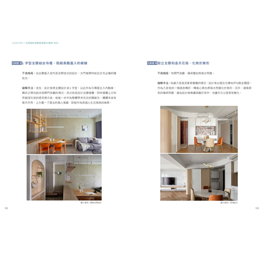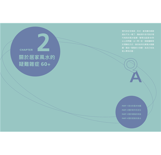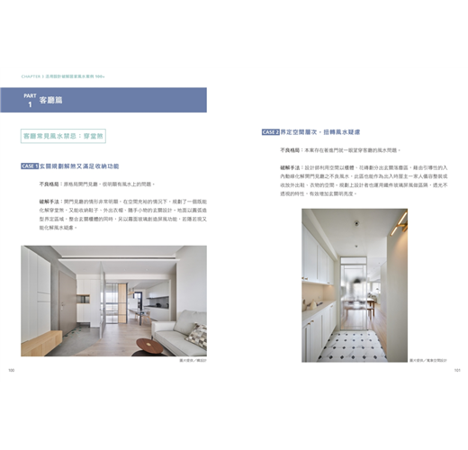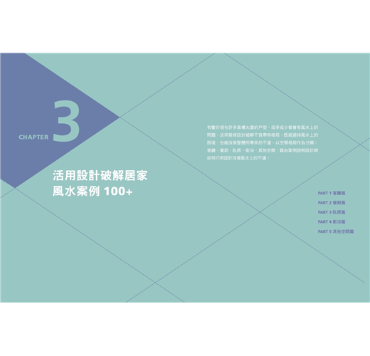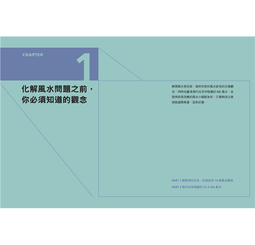 本書透過三個章節來加以說明,「CHAPTER 1 化解風水問題之前,你必須知道的觀念」即提供讀者對於風水該有的正確觀念,以及了解那些暗藏於現代居家的NG風水;「CHAPTER 2 關於居家風水的疑難雜症60+」集結現代人對現代格局風水疑問,透過一問一答方式,解開風水禁忌;「CHAPTER 3 活用設計破解居家風水案例100+」以空間格作為分類,藉由案例說明設計師如何巧用設計改善風水上的不適。