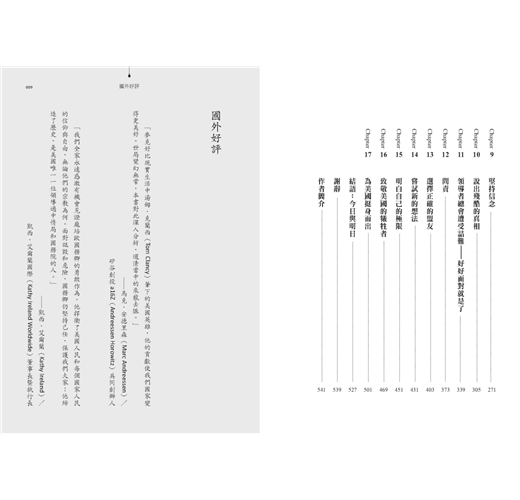 「這是一本貨真價實的傑作,讀來宛如驚悚小說,充滿重要的見解;文筆詼諧風趣,儘管內容有時令人感到不安,但作者以一種獨特且正面的方式傳達了這些資訊。每一頁都可以看到作者深深熱愛國家,以及他如何為美國立國基本文件所載的原則做出貢獻。這本扣人心弦的回憶錄總結了美國在當今日益危險的世界所面臨的挑戰,極具說服力。」——瑪麗.安.格蘭登(Mary Ann Glendon)/哈佛大學法學榮譽教授、前美國駐聖座大使