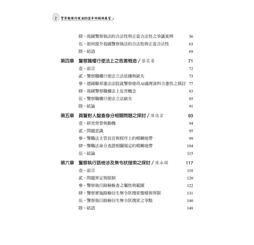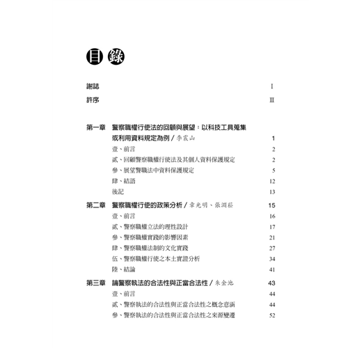 本書共分為十八章,分別為第一章警察職權行使法的回顧與展望:以科技工具蒐集或利用資料規定為例,由李震山前大法官撰寫;第二章警察職權行使的政策分析,由章光明教授及張淵菘副教授撰寫;第三章論警察執法的合法性與正當合法性,由朱金池教授撰寫;第四章警察職權行使法上之危害概念,由蔡震榮教授撰寫;第五章員警對人盤查身分相關問題之探討,由陳俊宏副教授撰寫;第六章警察執行路檢涉及無令狀搜索之探討,由陳永鎮教授撰寫;第七章員警攔檢案例分析,由蔡庭榕教授撰寫;第八章員警巡邏時隨機盤查路人案例,由許福生教授撰寫;第九章從晚近司法裁判實務檢視警察職權行使法有關臨檢規定之合理性,由李東穎助理教授撰寫;第十章論警察職權行使法之「場所」概念,由陳景發副教授撰寫;第十一章從交通違規舉發案例論警察職權行使法之定位,由蔡佩潔副教授撰寫;第十二章警察蒐集處理及利用個人資料之法律依據,由許義寶教授撰寫;第十三章警察透過資訊科技進入電腦蒐集資料的法律問題,由黃清德教授撰寫;第十四章警察即時強制法制之探討,由劉嘉發副教授撰寫;第十五章警察職權行使補償制度之研究,由洪文玲教授撰寫;第十六章警察職權行使法與科技偵查,由鄭善印教授撰寫;第十七章刑事訴訟法與警察法上科技偵查手段:以德國法為中心,由林宇軒助教教授撰寫;第十八章少年警察職權之變革:從績效導向到防治網絡之建構,由黃翠紋教授撰寫。內容大致聚焦在身分查證、資料蒐集及處理、即時強制、救濟等相關警察職權行使之問題,並輔以案例研析及展望未來職權行使發展趨勢,以期達到理論與實務並重。