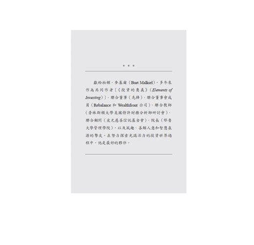 「將彬彬有禮而迷人的查爾斯.艾利斯描述成一位革命家似乎有些奇怪,但他真的是一位革命家。你將在這本精彩的文集裡發現,他不僅比大多數的人更早認識到投資是一場輸家遊戲,而且,他還更進一步的採取了一個重要步驟,那就是找出投資者們可以做些什麼來提高自己的投資成功率。想要一個更舒適的財務未來嗎?你會在查爾斯一生的智慧話語中找到關鍵答案。」──喬納森.克雷蒙,HumbleDollar.com 編輯及前華爾街日報個人理財專欄作家